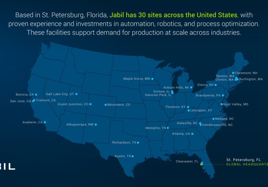 Based in St. Petersburg, Florida, Jabil has 30 sites across the United States, with proven experience and investments in automation, robotics, and process optimization. These facilities support demand for production at scale across industries.